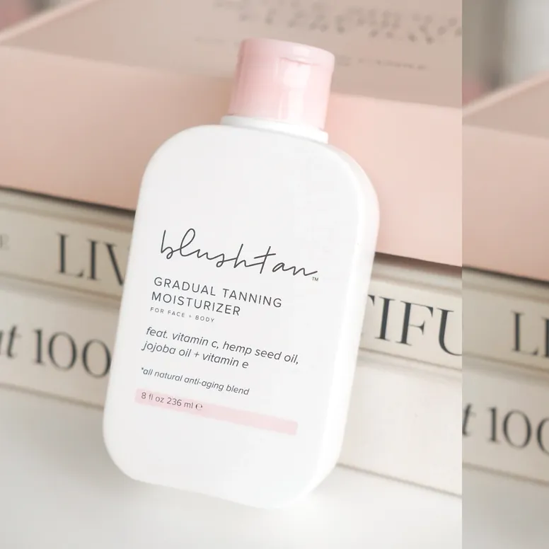 the blushtan® gradual tanning moisturizer contains plant derived dha to provide a natural, even faux-glow within 12-24 hours of application. hydrates the skin and diminishes signs of aging. safe for those with acne, eczema and psoriasis. can be used alone to build desired color, or to extend the life of your blushtan® solution spray tan. available in tsa approved 3oz travel size + 8oz.