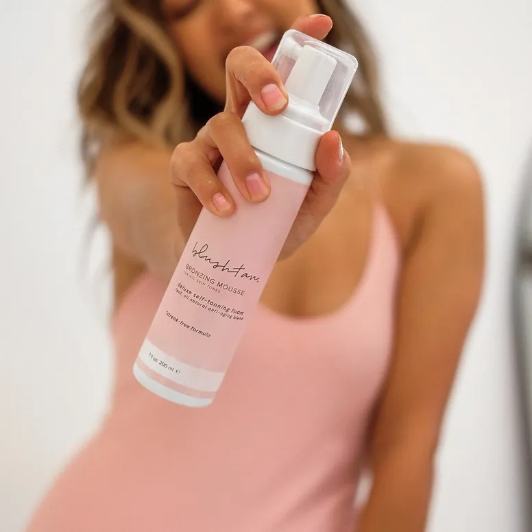 get the quality of a blushtan® spray tan at home! this mousse contains plant derived dha + a cool-brown color designed to look flawless on all skin tones. combined with all natural, anti-aging ingredients that help to moisturize the skin + minimize the appearance of cellulite, fine lines + wrinkles. also reduces inflammation + redness caused by acne, sunburn, eczema + psoriasis. specifically designed to alleviate dry skin, allowing your faux tan to set + fade evenly.